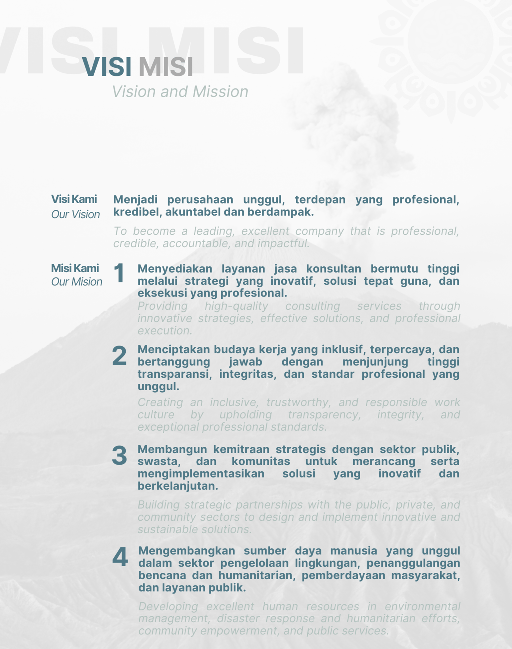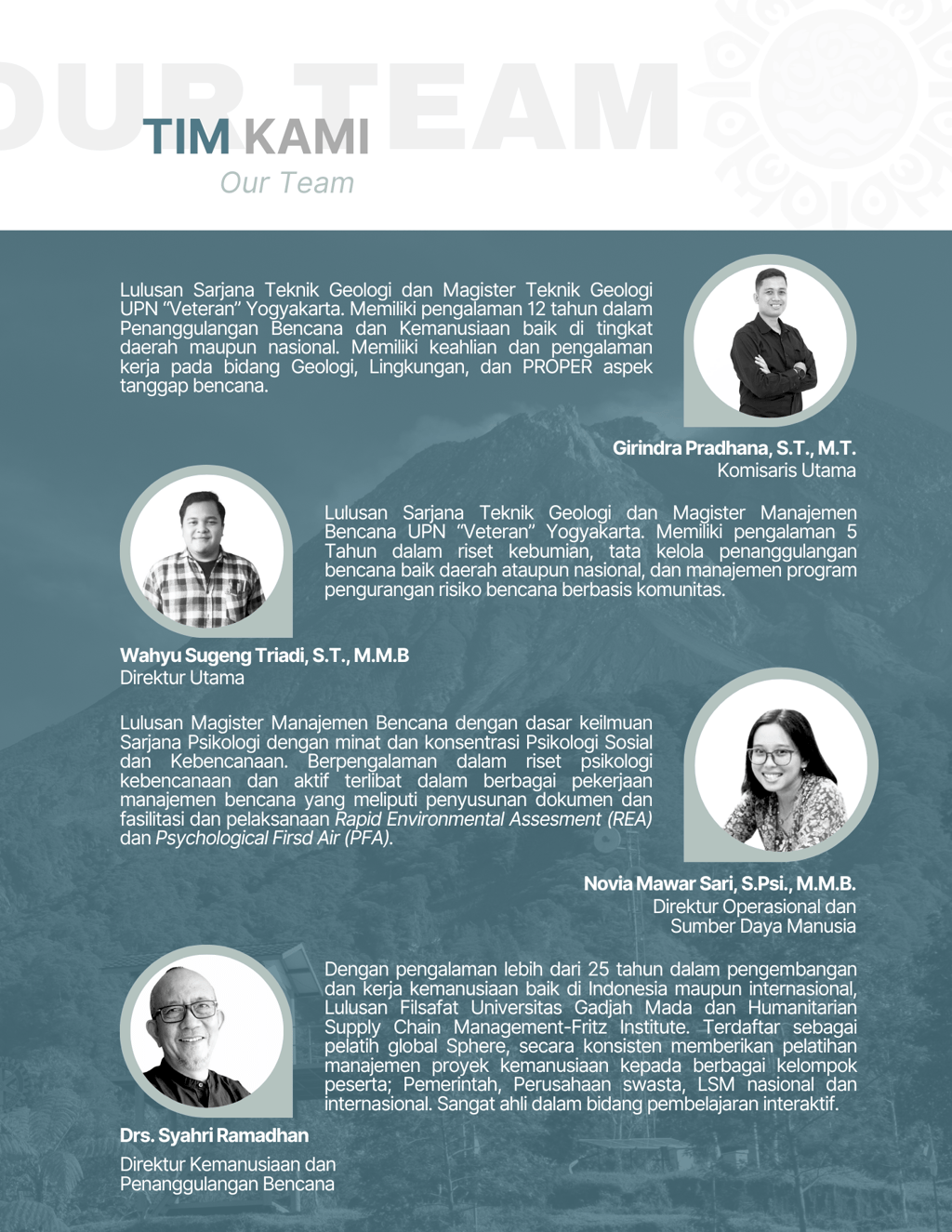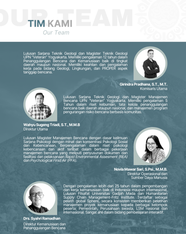 Keunggulan kami terletak pada keberagaman komposisi tim, baik dalam in-house consultant maupun tim roster yang kami miliki. Tim kami terdiri dari akademisi aktif yang terus memperbarui pengetahuan mereka dengan riset dan kajian ilmiah terbaru, memastikan setiap solusi yang kami tawarkan berbasis data dan teori terkini. Selain itu, kami didukung oleh praktisi di dunia kebencanaan yang memiliki pengalaman di tingkat nasional dan internasional, membawa perspektif global dalam penanganan bencana dan pengurangan risiko.