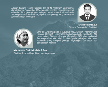 Tim ahli kami terdiri dari para profesional berpengalaman dengan keahlian lintas disiplin yang mendukung keberhasilan setiap proyek secara komprehensif. Dengan latar belakang kuat di bidang geologi dan geofisika, tim kami mampu menganalisis kondisi geologi secara mendalam untuk mendukung berbagai kebutuhan, mulai dari identifikasi potensi risiko bencana alam hingga eksplorasi sumber daya alam.